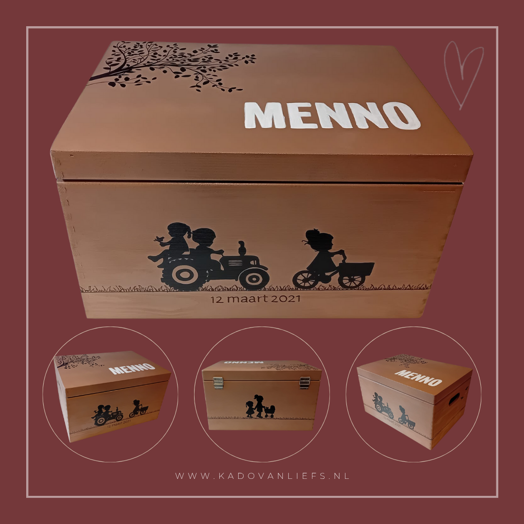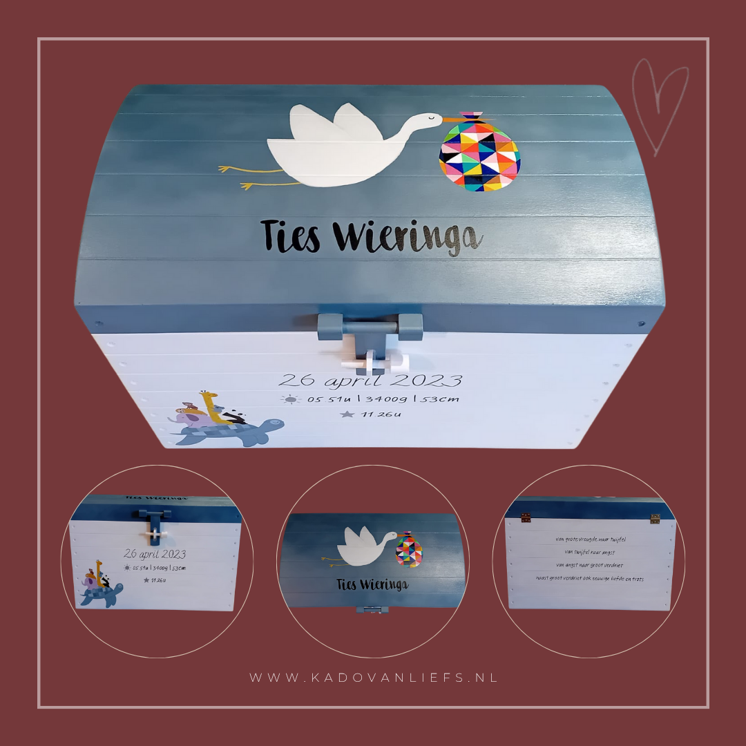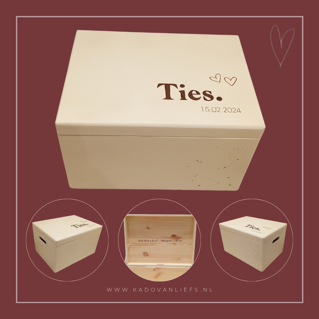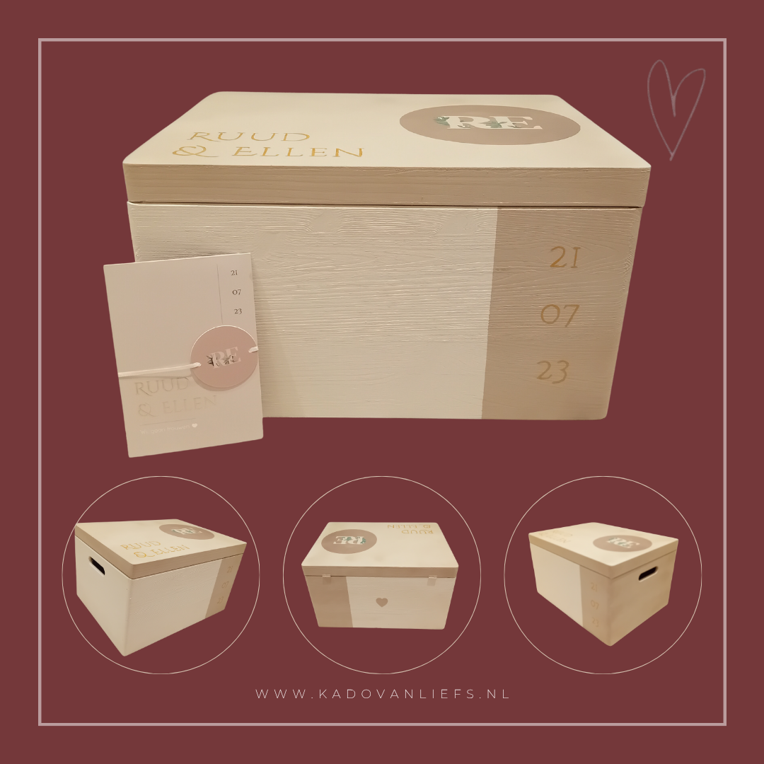 Bewaar je mooiste herinneringen met liefde. Of het nu gaat om kostbare spullen van de geboorte of bijzondere items van jullie trouwdag, een handbeschilderde kist in de stijl van het geboortekaartje of de trouwkaart maakt het extra speciaal.