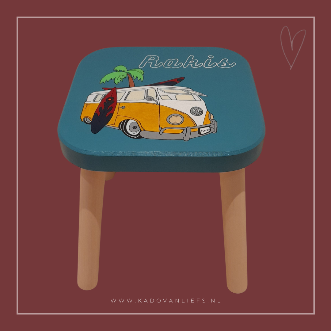 Je kunt het krukje laten beschilderen in de stijl van het geboortekaartje of laten ontwerpen naar eigen wens.