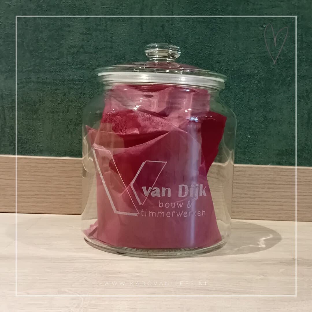Gegraveerde potten met eigen naam, tekst of afbeelding.Keuze uit:- Grote Weckpot (€ 12,50)